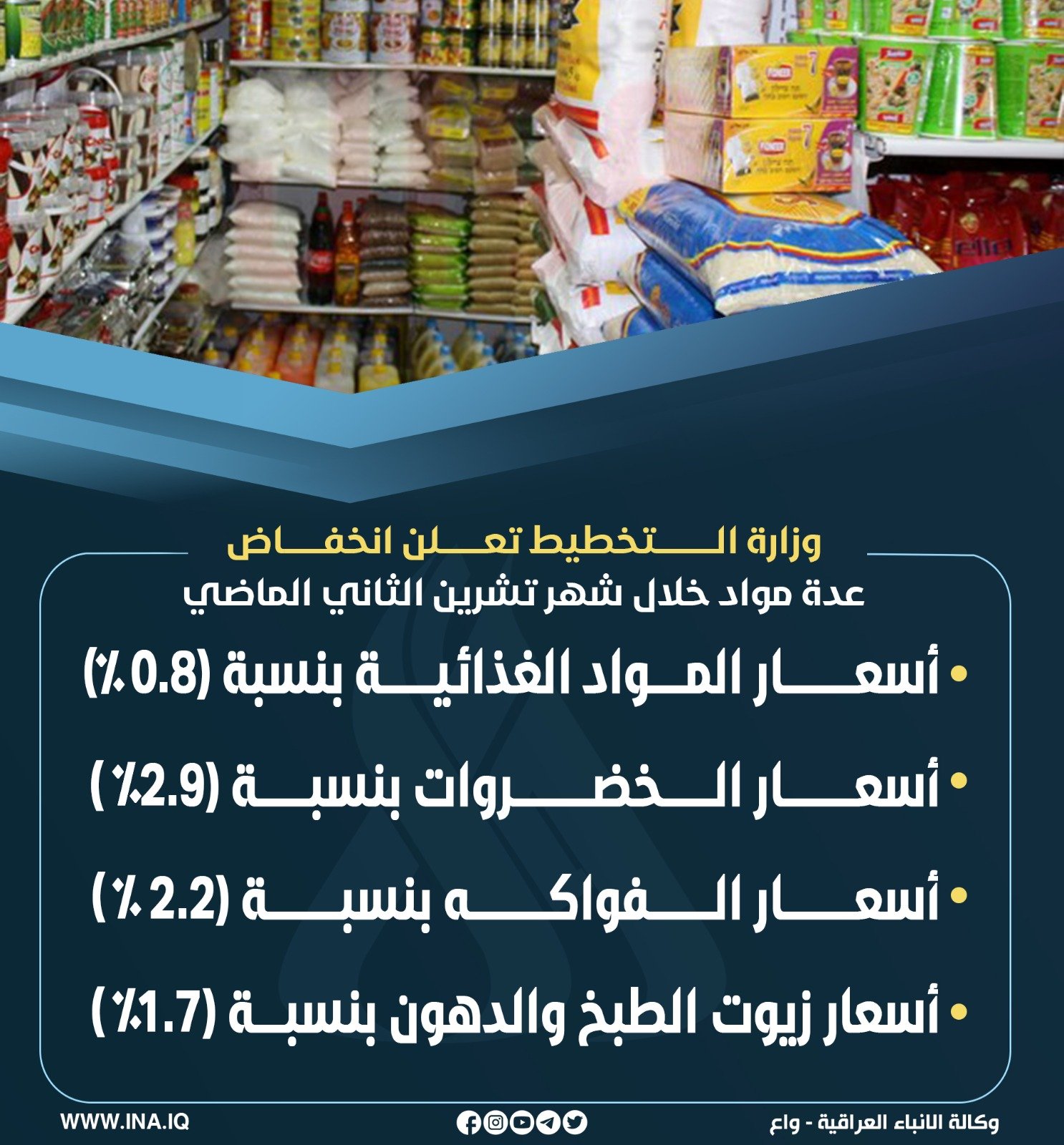 التخطيط تعلن انخفاض عدة مواد خلال شهر تشرين الثاني الماضي أعلنت وزارة التخطيط، عن انخفاض عدة مواد خلال شهر تشرين الثاني الماضي