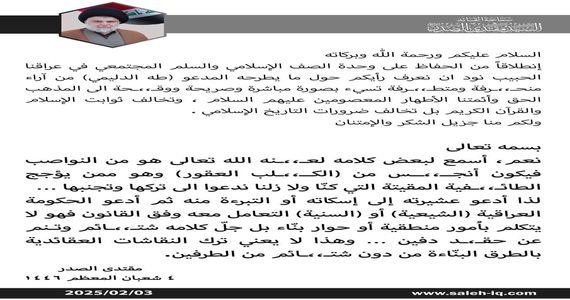 الصدر يدعو الحكومة إلى التعامل وفق القانون ضد الأصوات التي تعمل على تأجيج الطائفية المقيتة