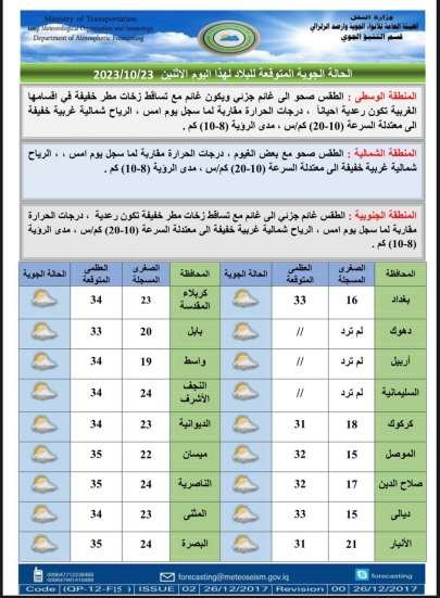 طقس العراق.. حرارة ثلاثينية وأجواء غائمة تصاحبها فرض لتساقط أمطار رعدية