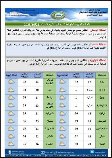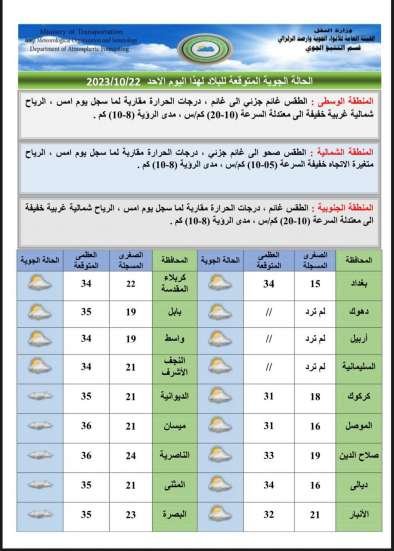 العراق.. أجواء غائمة وفرص لتساقط أمطار رعدية اعتبارًا من الغد