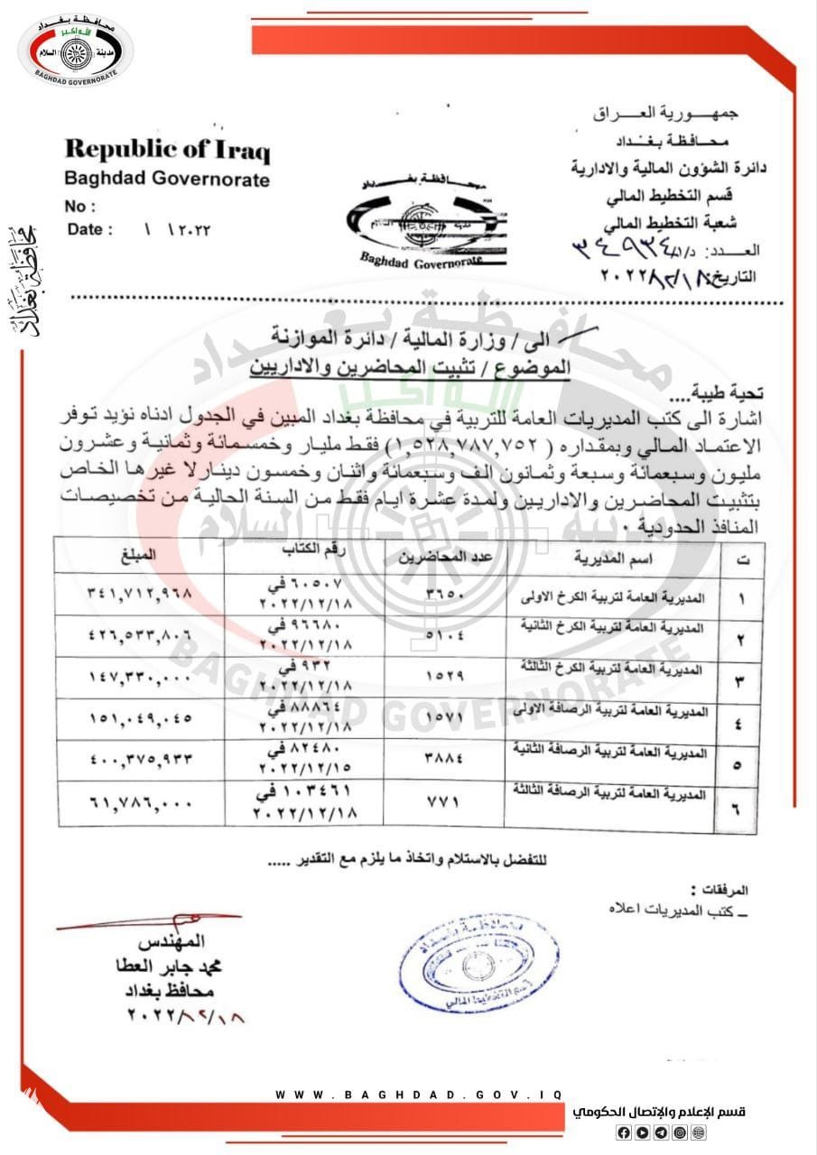 محافظ بغداد يفاتح المالية لتثبيت المحاضرين لمن خدمته سنتان فأكثر