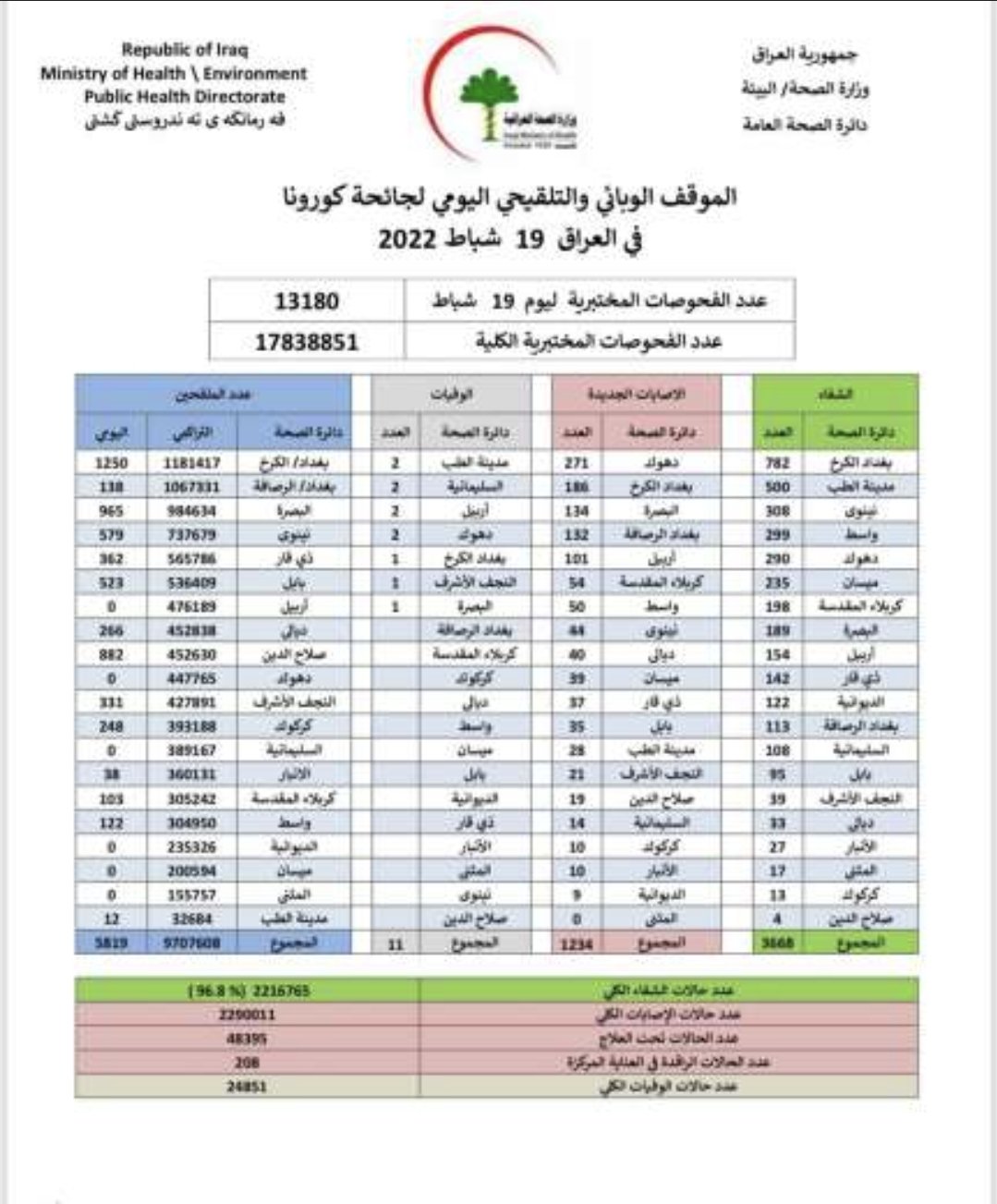 العراق يسجل موقفاًوبائياً منخفضا بوفيات وإصابات الجائحة