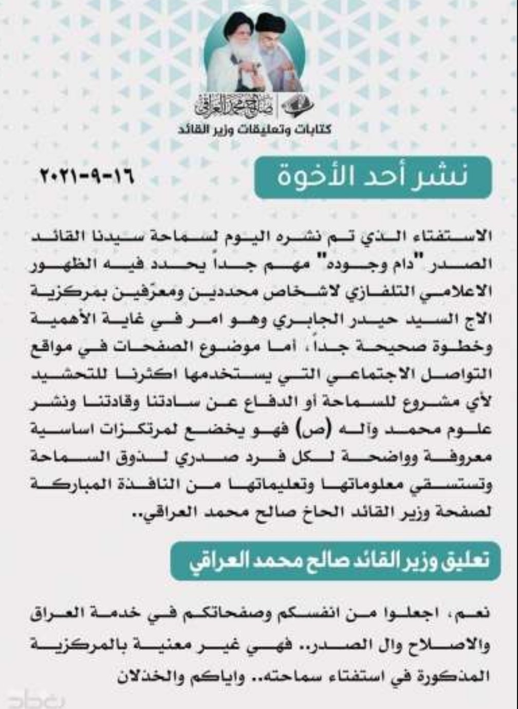 وزير الصدر يخاطب أتباعه بشأن استفتاء لزعيمه: إياكم والخذلان