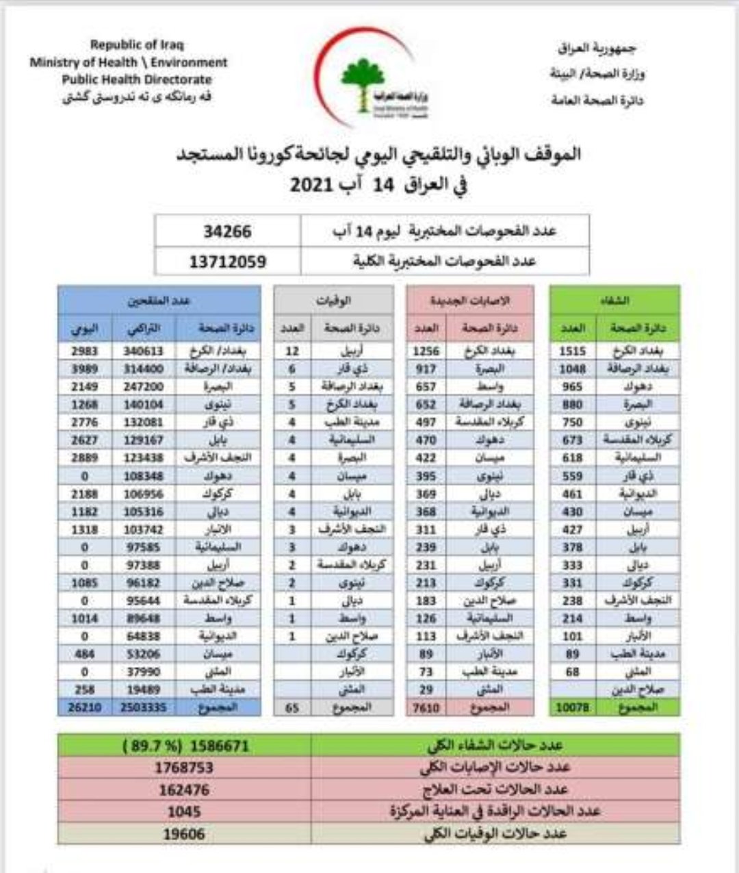 العراق يسجل انخفاضاً بإصابات كورونا وارتفاعاً بحالات الشفاء