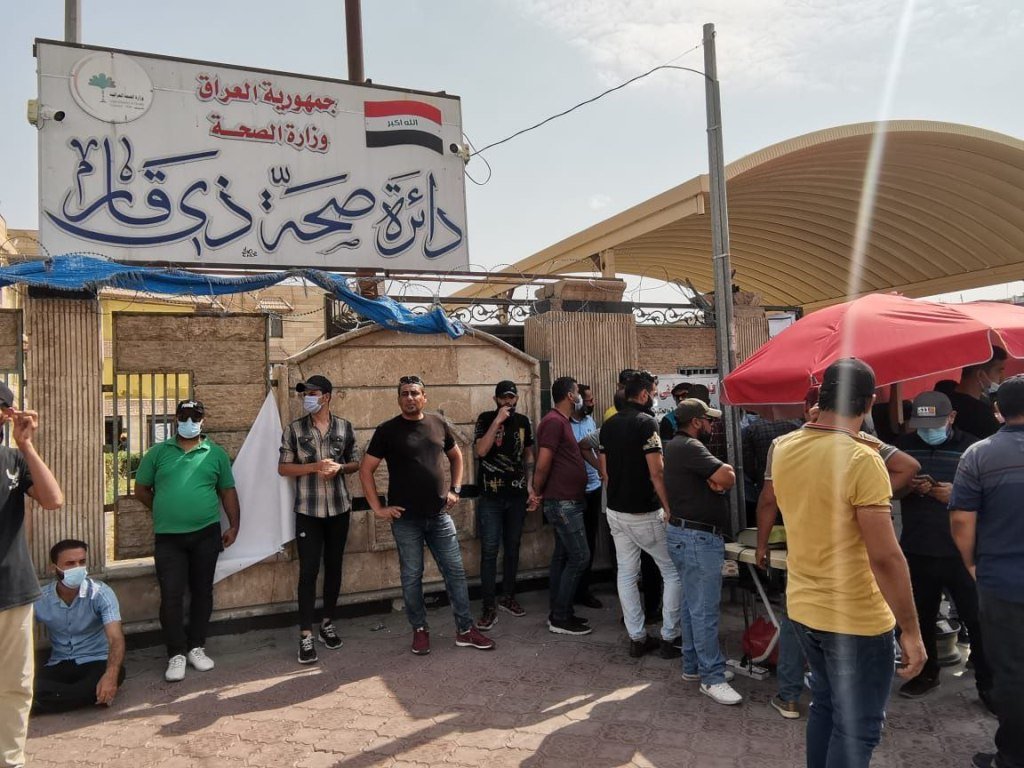 محتجون من عقود صحة ذي قار يتظاهرون أمام الدائرة احتجاجا على قطع رواتبهم