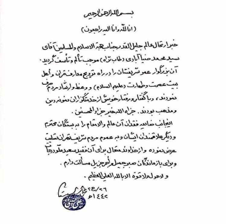 السيستاني يعزي بوفاة حجة الإسلام والمسلمين السيد محمد آبادي