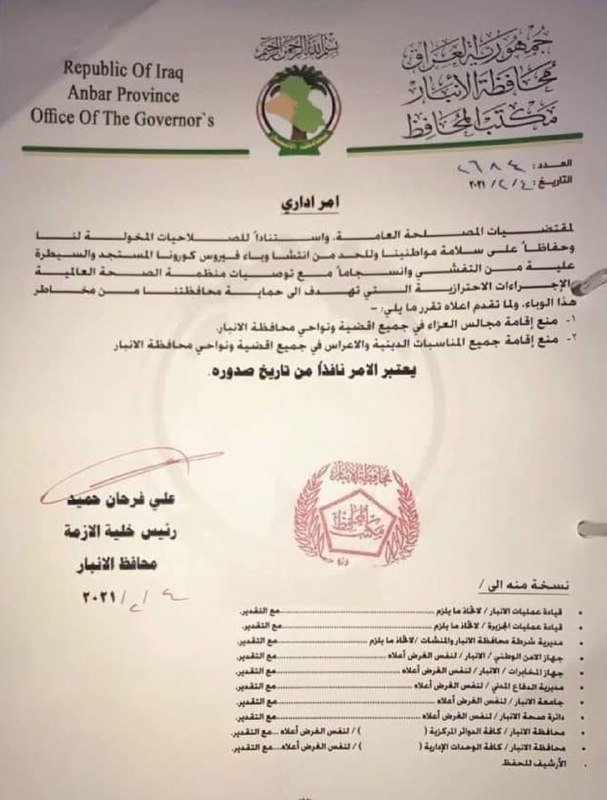 الانبار تصدر قرارات جديدة للحد من انتشار كورونا (وثيقة)