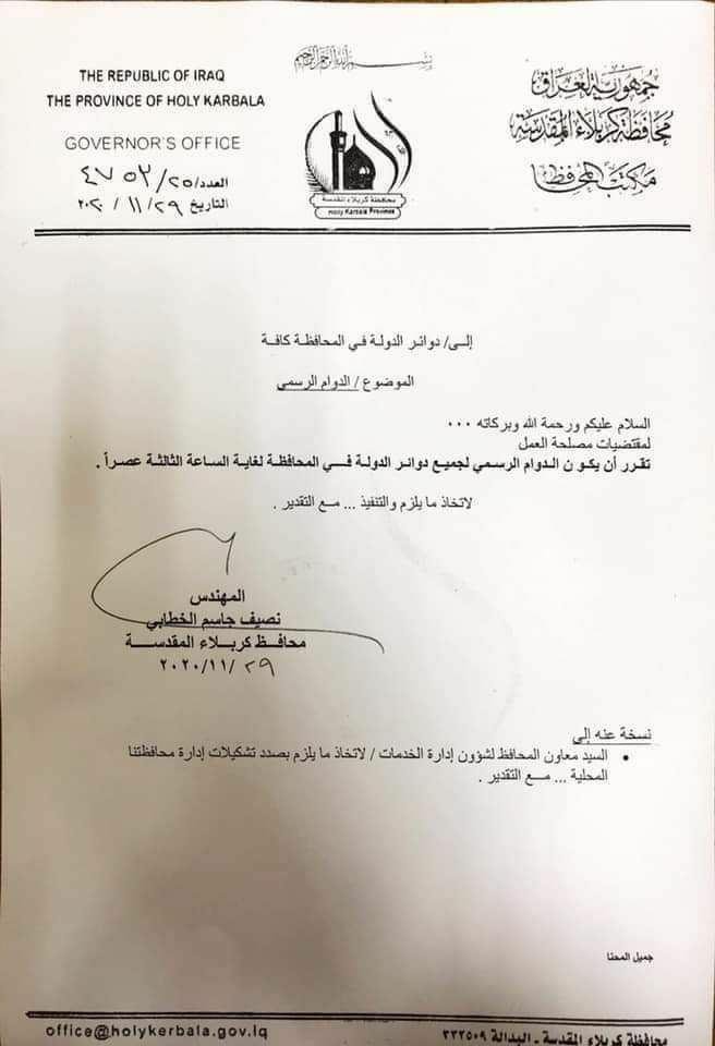 كربلاء تحدد الدوام الرسمي في الدوائر الحكومية