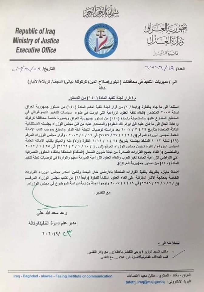 بالوثيقة.. العدل تصدر قرارا بالتريث في الغاء العقود الزراعية بالمناطق المتنازع عليها