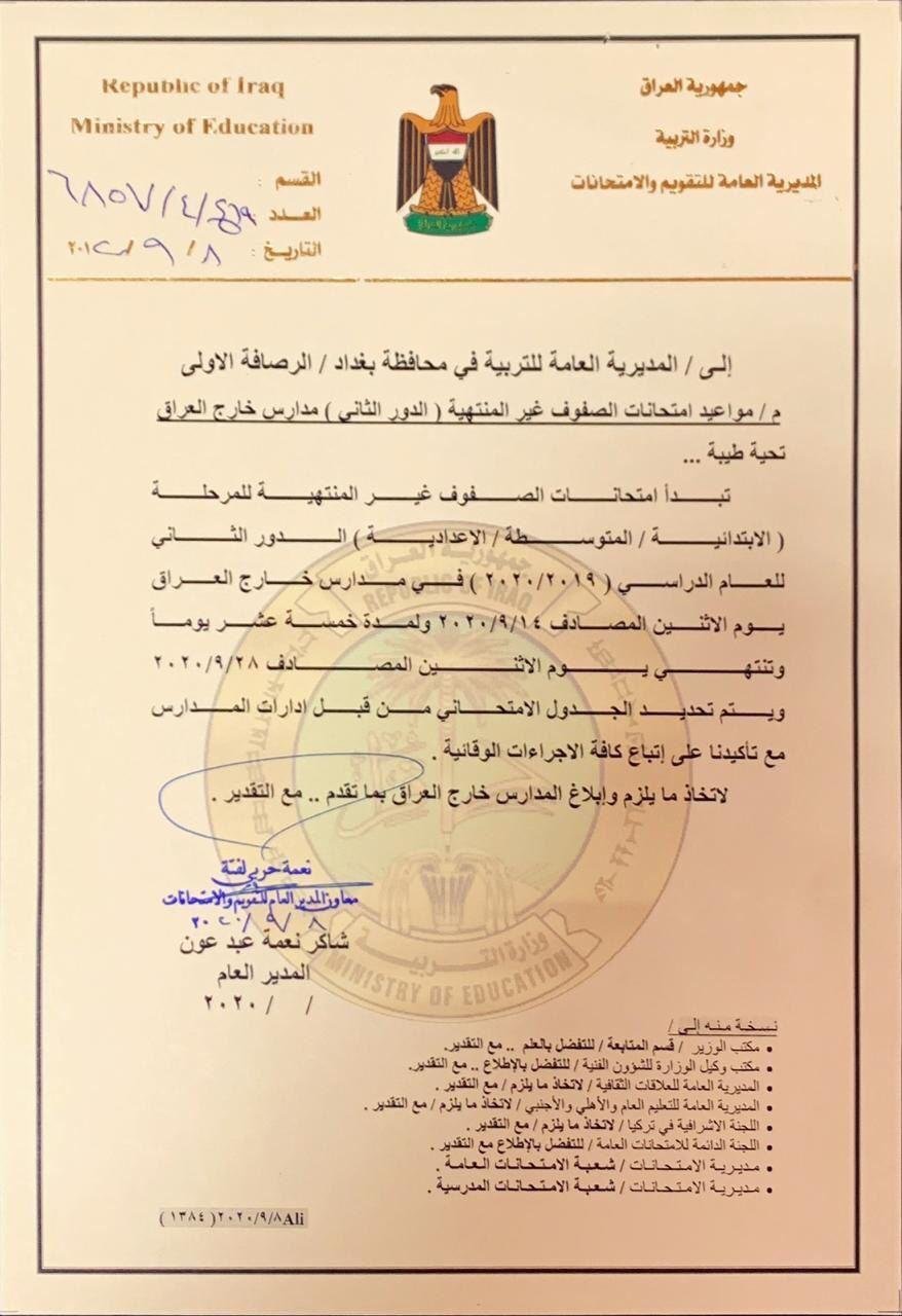 التربية تحدد الـ14 من أيلول موعداً لبدء امتحانات (الدور الثاني) للصفوف غير المنتهية لمدارس خارج العراق