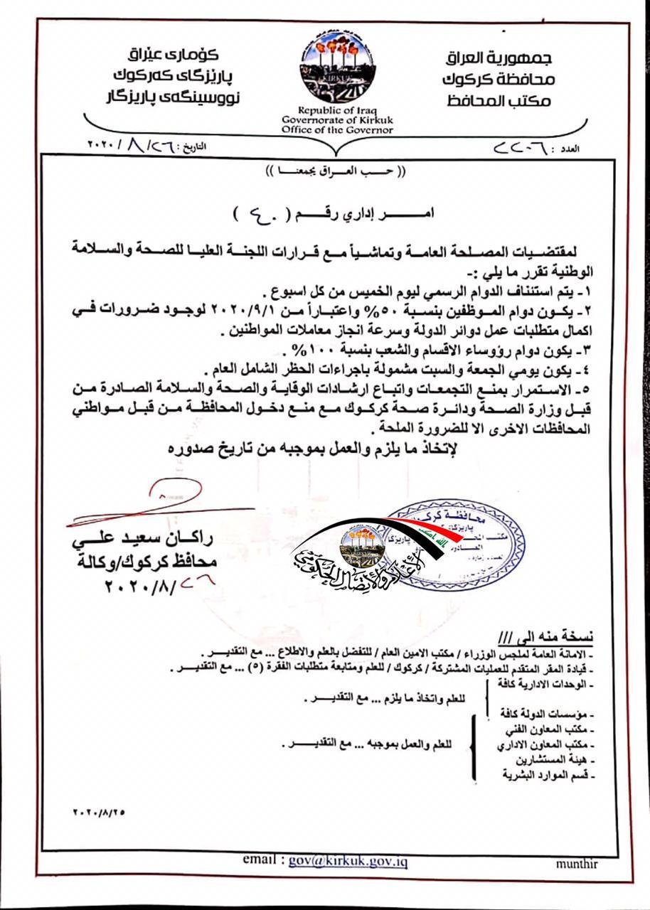 قرارات جديدة بشأن الدوام وحظر التجوال في كركوك.. وثيقة