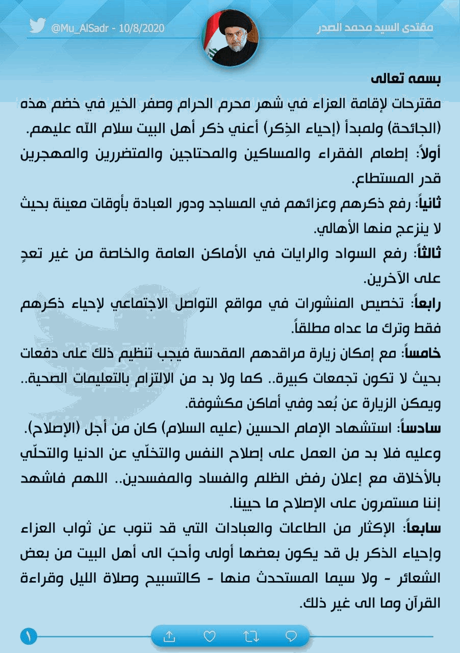 الصدر يقدم 11 مقترحاً لـ'إقامة العزاء' في شهري محرم وصفر