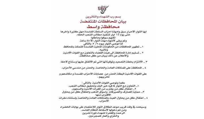 في بيان... متظاهرو واسط يحذرون من تسويف مطالبهم السابقة