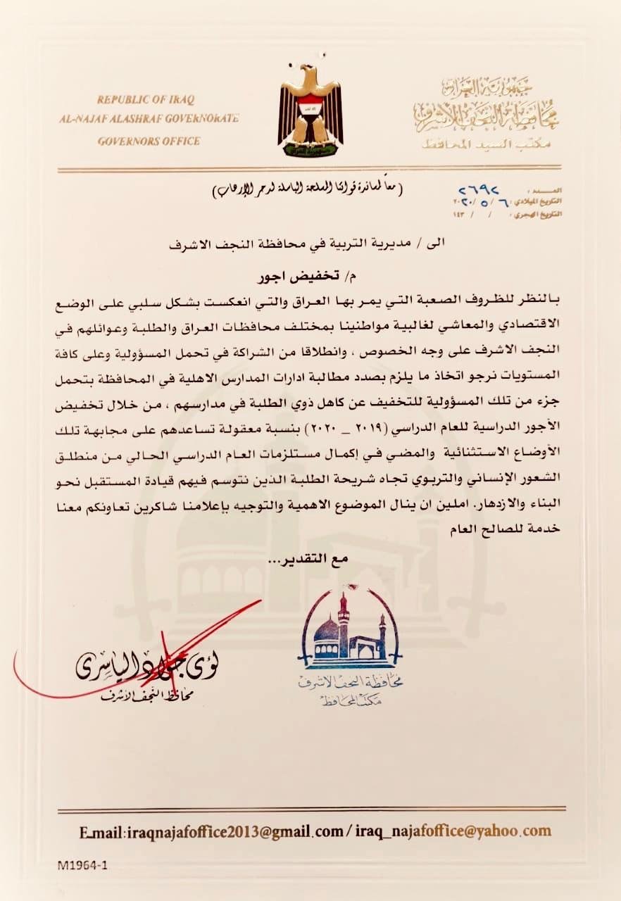 محافظ النجف يطالب المدارس الاهلية بتخفيض الاجور الدراسية