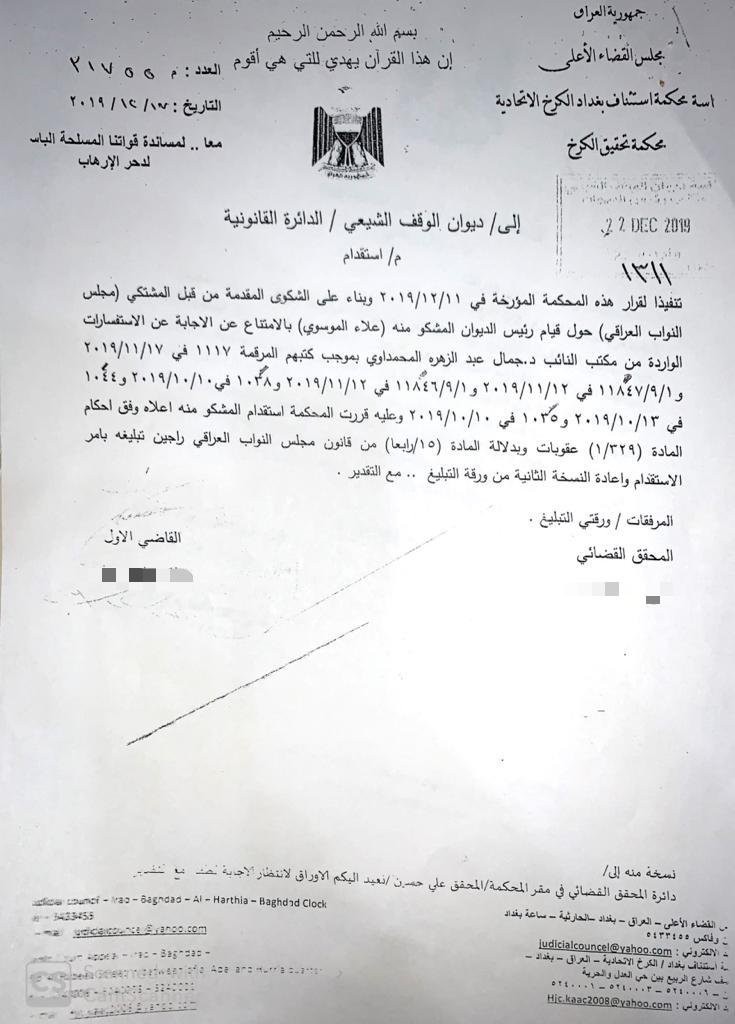 القضاء يصدر أمر استقدام بحق رئيس ديوان الوقف الشيعي