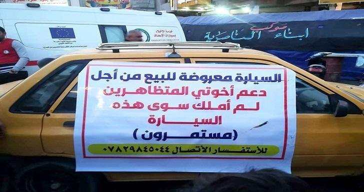 في ذي قار... متظاهرون يعرضون مقتنياتهم ومركباتهم الخاصة للبيع دعما لساحات الاعتصام