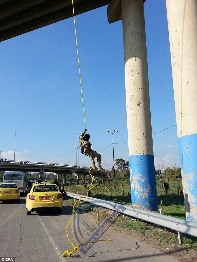مدينة الموصل العراقية تظهر عشرات المسلحين من داعش يهبطون من فوق جسر الطريق السريع