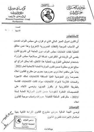 واقترحت اللجنة المالية النيابية، "الإبقاء على التخصيصات المقدرة لمفوضية الانتخابات ضمن قانون الموازنة المالية لسنة 2021 مالم تقدم السلطة التنفيذية مبررات وأسباب موجبة للقانون أعلاه"، فيما أوصت بـ"عرض مشروع قانون تمويل نفقات انتخابات مجلس النواب للقراءة الثانية في البرلمان بغية استكمال الاجراءات لتشريع القانون