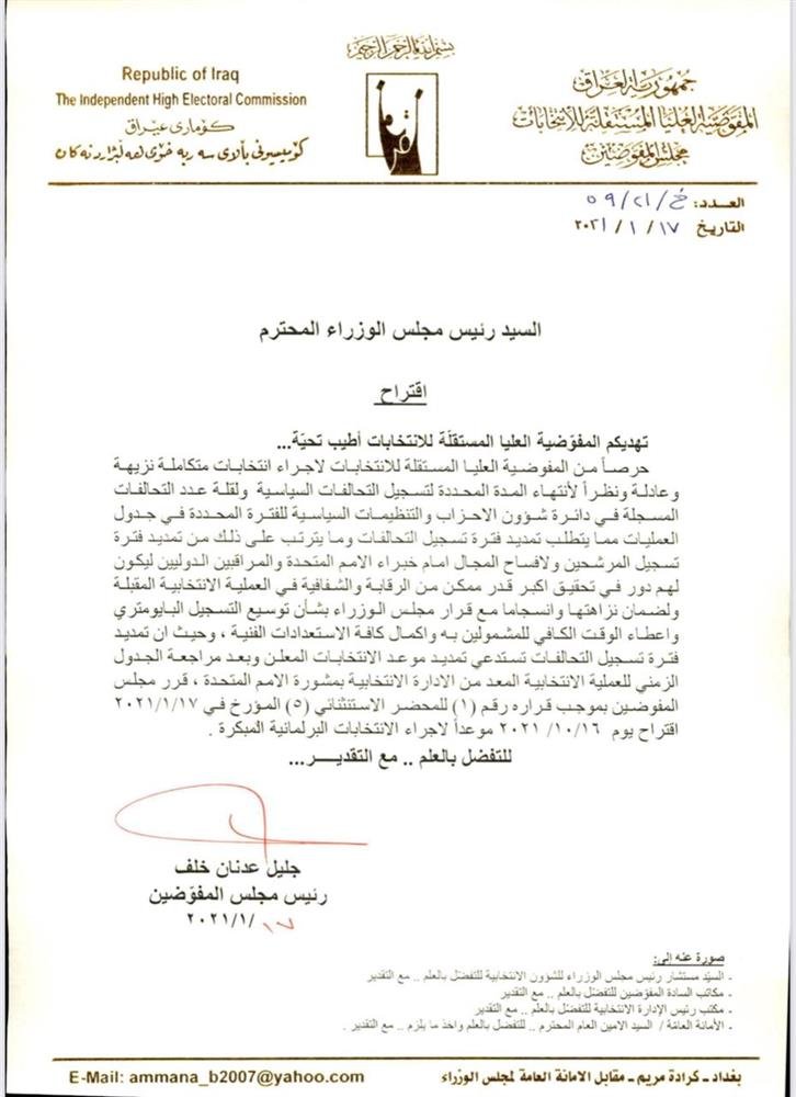 تنشر وكالة من كربلاء الخبر مقترح قدمته المفوضية العليا المستقلة للإنتخابات لرئيس الوزراء مصطفى الكاظمي بإجراء الإنتخابات المبكرة في 16-10-2021 نتيجة جملة من الأسباب وضحها الطلب المبين في أدناه.