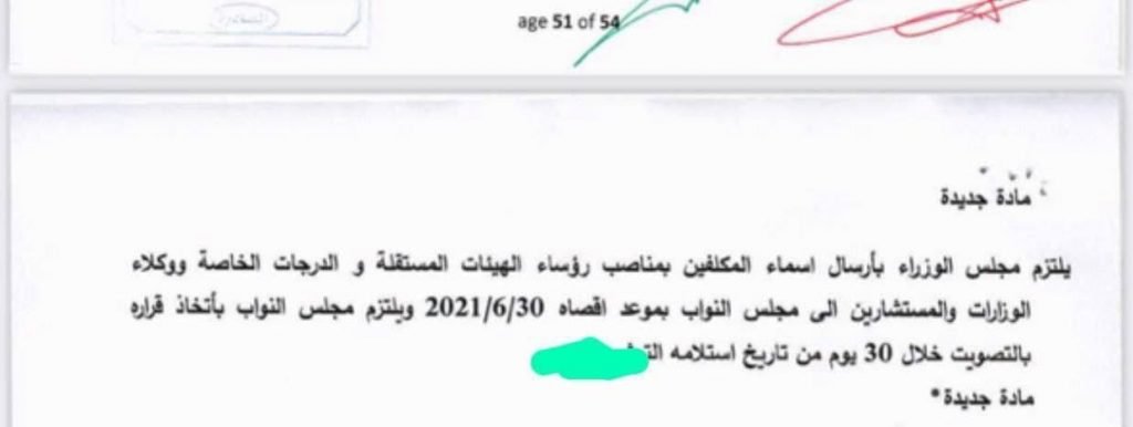 وصوت المجلس على مادة في الدستور تنص على “يلزم مجلس الوزراء بإرسال أسماء المكلفين بمنصب رؤساء الهيئات المستقلة والدرجات الخاصة ووكلاء الوزارات والمستشارين إلى مجلس النواب بموعد إقصاه 2021 /6/30 ويلتزم محجلس النواب باتخاذ قراراه بالتصويت خلال 30 يوم من تاريخ استلامه”.