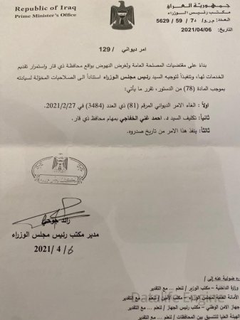 كما أصدر مدير مكتب رئيس الوزراء في وثيقة أخرى قراراً يتضمن "بناءً على مقتضيات مصلحة العمل، ولغرض النهوض بواقع محافظة ذي قار، وتنفيذاً لتوجيه رئيس مجلس الوزراء، تقرر ما يأتي: