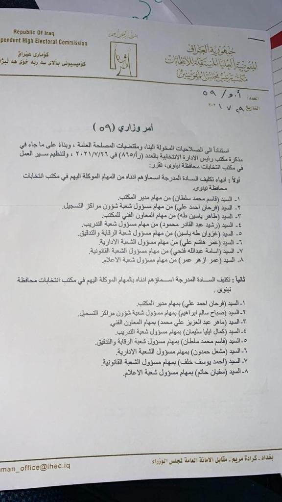 اجرت المفوضية العليا المستقلة للانتخابات، تغييرات في المناصب بمكتبها في نينوى.
