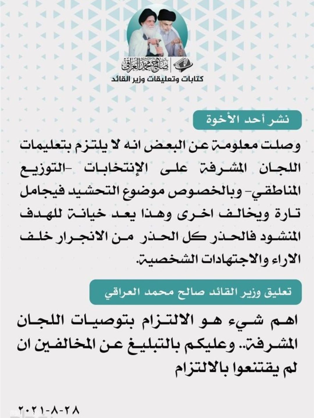 علق صالح محمد العراقي، المقرب من زعيم التيار الصدري مقتدى الصدر، اليوم السبت، على عدم الالتزام بتعليمات اللجان المشرفة على الانتخابات.وقال العراقي في تغريدة له ردا على سؤال أحد اتباع الصدر بشأن عدم التزام البعض بتعليمات اللجان المشرفة على الانتخابات تابعه صحفي ان "أهم شيء هو الالتزام بتوصيات اللجان المشرفة على الانتخابات"، مطالبا بـ"التبليغ عن المخالفين".![]()