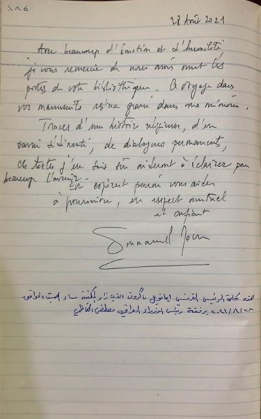 وقال ماكرون، في نص رسالته : "بتأثر وتواضع كبيرين أشكركم على فتح أبواب مكتبتكم لنا، هذه الرحلة في مخطوطاتكم ستكون محفورة في ذاكرتي".