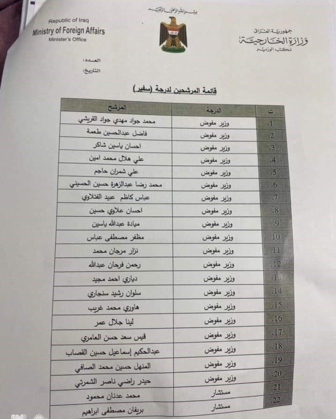 قال مصدر الاحد، بأن وزارة الخارجية ارسلت قوائم السفراء وغيرهم إلى البرلمان العراقي من أجل التصويت عليها وفق نظام المحاصصة.