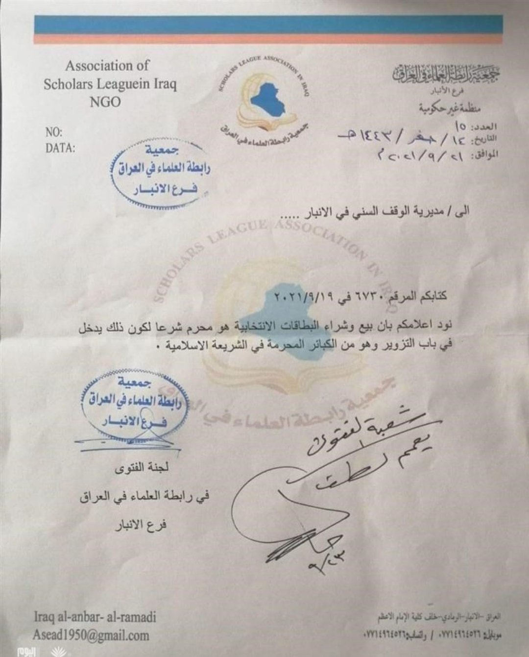 أصدرت رابطة العلماء في العراق، اليوم الثلاثاء، فتوى تخص بيع وشراء البطاقات الانتخابية، واصفة الامر بانه من "الكبائر".وذكرت شعبة الفتوى في الرابطة بوثيقة موجهة الى ديوان الوقف السني فرع الانبار : "نود اعلامكم بان بيع وشراء البطاقات الانتخابية محرم شرعا ويدخل من باب التزوير".ووصفت الامر بانه "من الكبائر في الشريعة الإسلامية".![]()