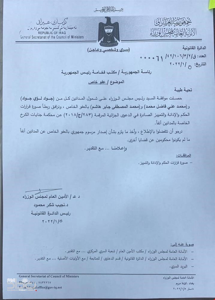 وتبين الوثيقة : "حصلت موافقة رئيس مجلس الوزراء مصطفى الكاظمي على شمول جواد لؤي واثنين اخرين بالعفو الخاص".