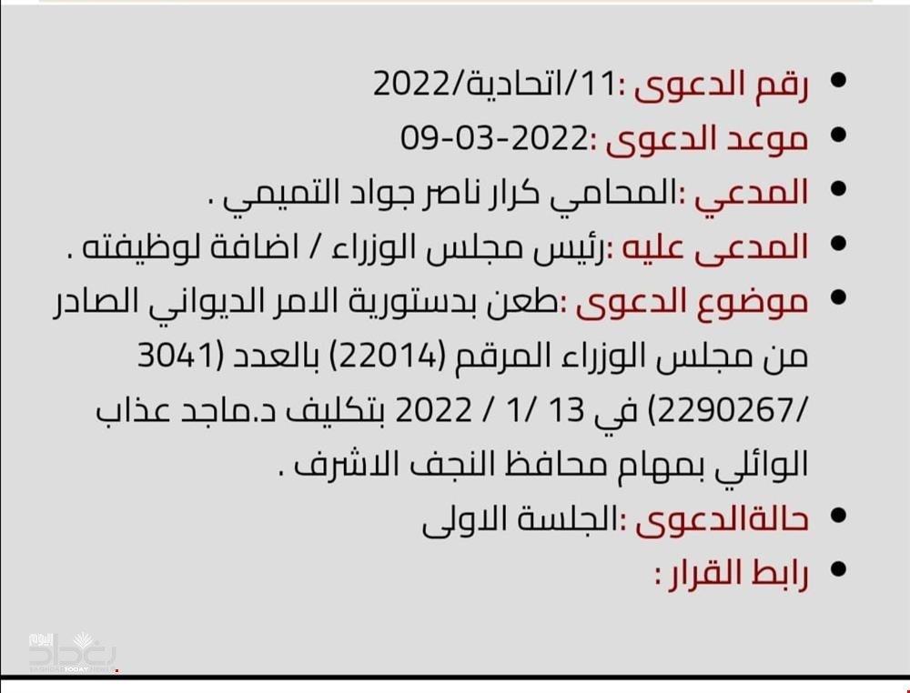 المحكمة الاتحادية العليا ترد الدعوى ( 11 اتحادية) المقامة ضد قرار رئيس الوزارء بتكليف محافظ النجف ماجد الوائلي.