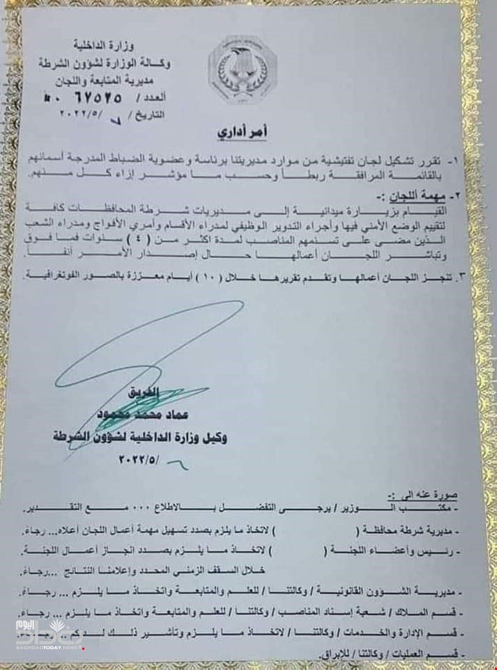 شكلت وزارة الداخلية، لجان تفتيش لتقييم الوضع الأمني في المحافظات كافة، وإجراء التدوير الوظيفي لمدراء الأقسام وآمري الأفواج ومدراء الشعب الذين مضى على تسنمهم المناصب لمدة أكثر من 4 سنوات فما فوق.