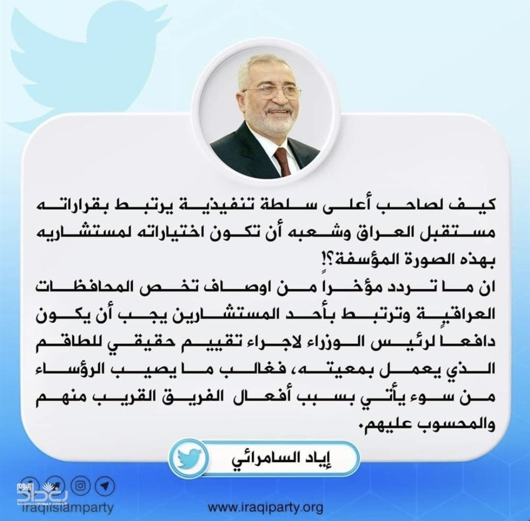 علق امين عام الحزب الاسلامي، اياد السامرائي على مستشاري رئيس الوزراء مصطفى الكاظمي، داعيا اياه باجراء تقييم لمستوياتهم.
