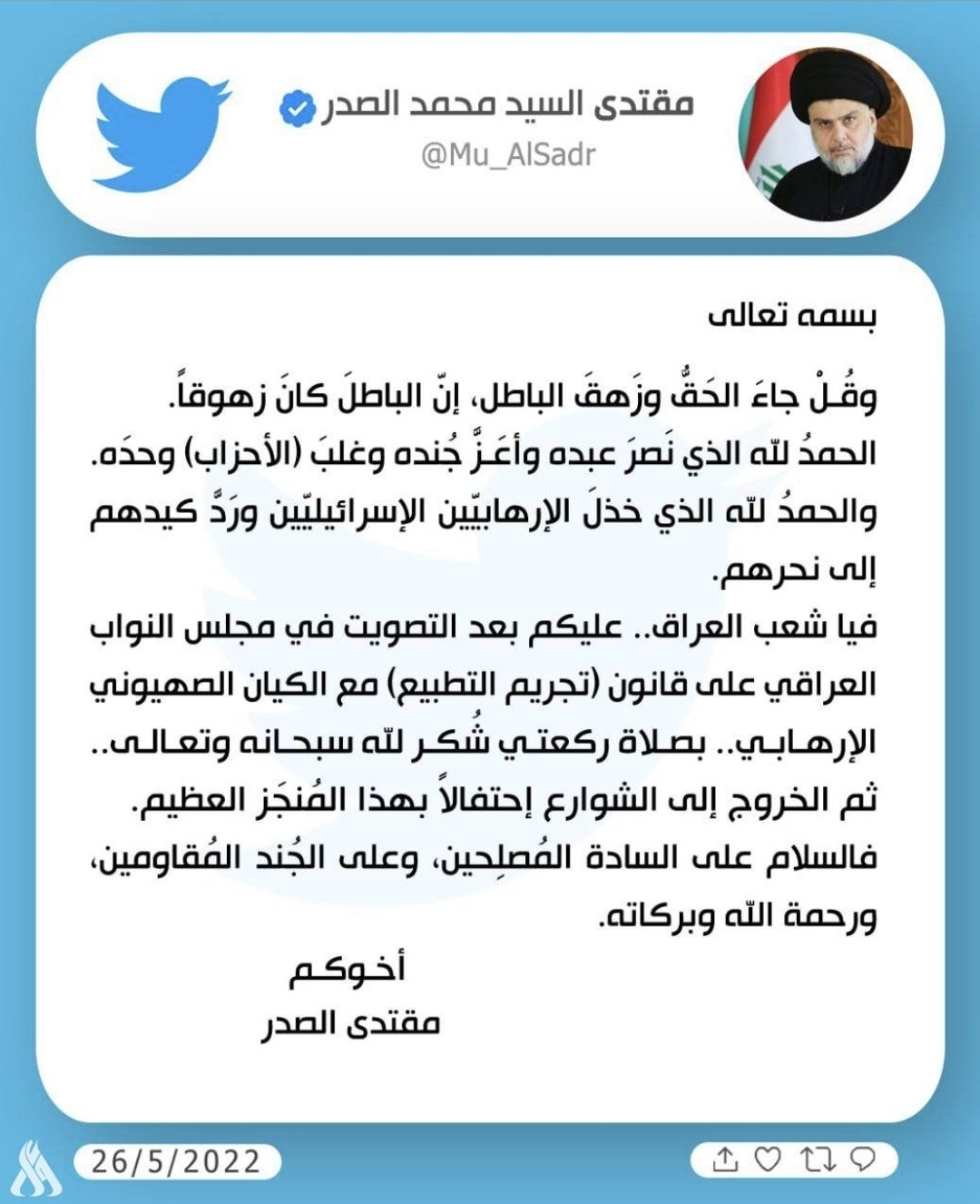 السيد الصدر يدعو للاحتفال في الشوارع بعد التصويت على قانون تجريم التطبيع