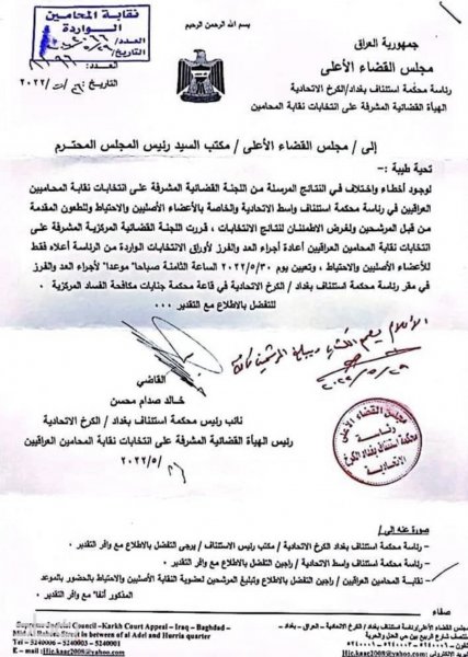 واظهرت وثيقة حصل عليها صحفي  إن "اللجنة القضائية المركزية المشرفة على انتخابات نقابة المحامين العراقيين تقرر إعادة إجراء العد والفرز لأوراق الانتخابات الواردة من محكمة استئناف واسط الاتحادية، لوجود أخطاء واختلاف في النتائج المرسلة من اللجنة القضائية المشرفة في المحكمة المذكورة والخاصة بالأعضاء الأصليين والاحتياط ".