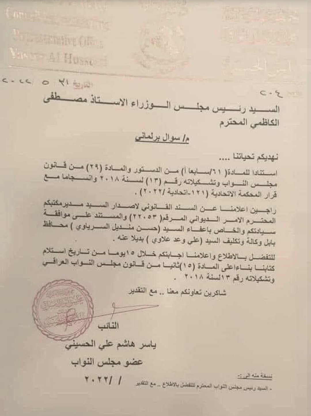 سؤال برلماني للكاظمي بشأن السند القانوني لإعفاء محافظ بابل (وثيقة)