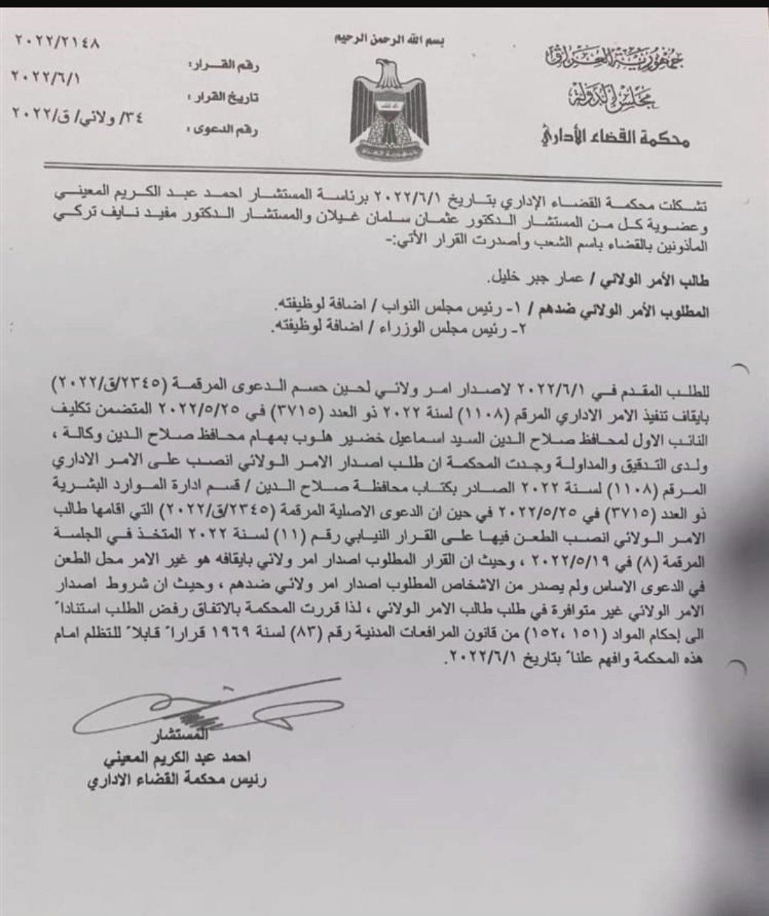 محكمة القضاء الإداري ترفض طلبا لمحافظ صلاح الدين المقال