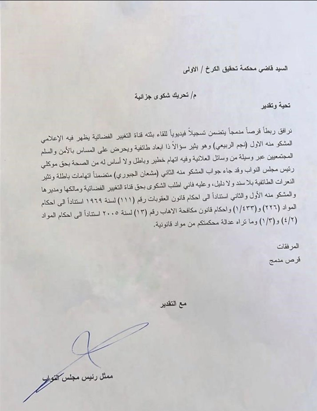 واظهرت وثيقة موقعة من ممثل مجلس النواب، تتضمن "ان الإعلامي نجم الربيعي يسأل أسئلة فيها ابعاد طائفية وتهدد السلم المجتمعي".