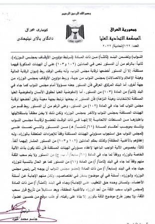 وقالت المحكمة في بيان إنها "اصدرت قرارها التفسيري بالعدد (122/ اتحادية / 2022) المتضمن تحديد آلية استجواب مسؤولي الهيئات المستقلة وفقاً لأحكام الدستور".