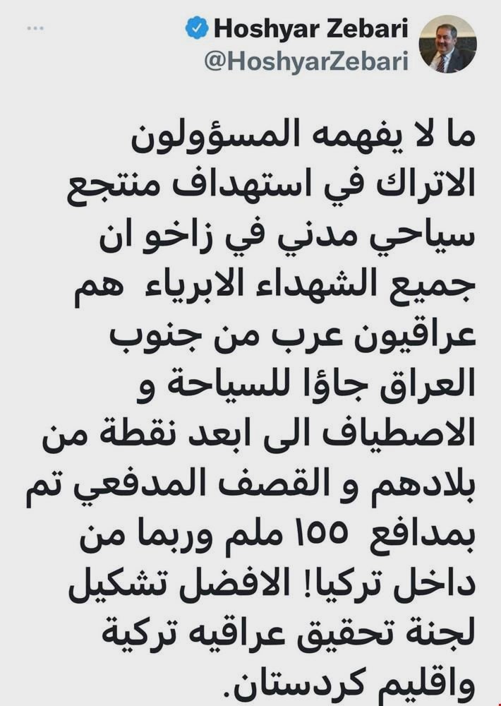أكد السياسي الكردي، هوشيار زيباري، اليوم الخميس، أن حادث قصف دهوك تم بمدفع تركي من نوع “155 ملم".ادناه نص تغريدة زيباري: