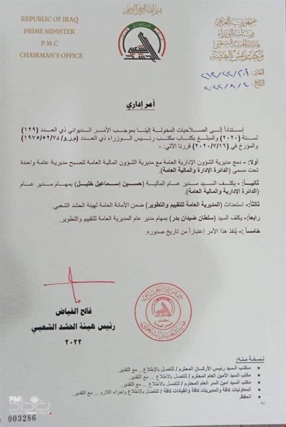 واظهرت وثيقة موقعة من الفياض،وحصلت وكالة من كربلاء الخبر على نسخة منه، دمج مديرية الشؤون الادارية التابعة للحشد مع الشؤون المالية لتكون مديرية جديدة مستحدثة، وتكليف حسين اسماعيل بادارتها.