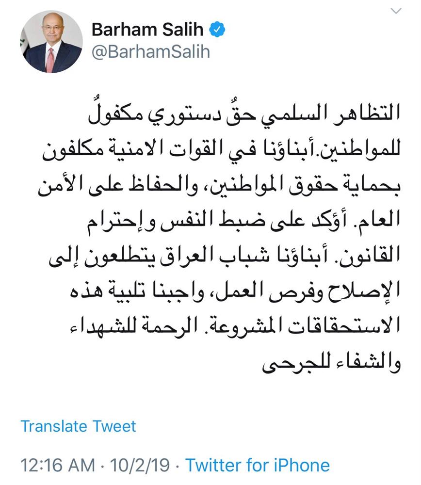 وأضاف رئيس الجمهورية: "أبناؤنا شباب العراق يتطلعون إلى الإصلاح وفرص العمل، واجبنا تلبية هذه الاستحقاقات المشروعة"، مختتماً تغريدته بالقول: "الرحمة للشهداء والشفاء للجرحى".