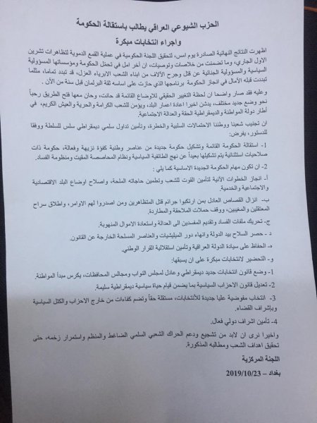 طالب الحزب الشيوعي العراقي، اليوم الاربعاء، باستقالة الحكومة الحالية وتشكيل جديدة.