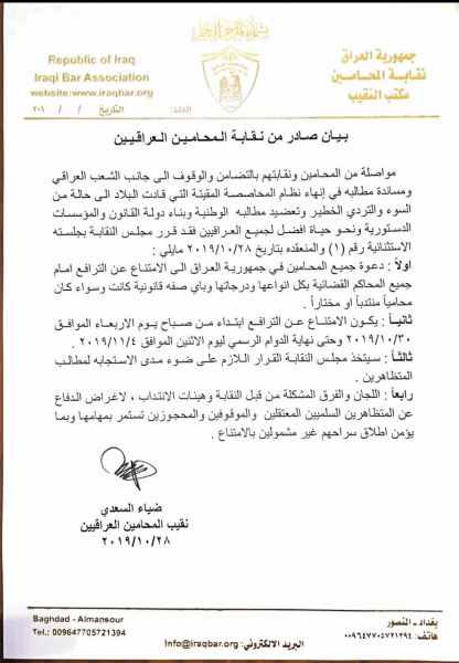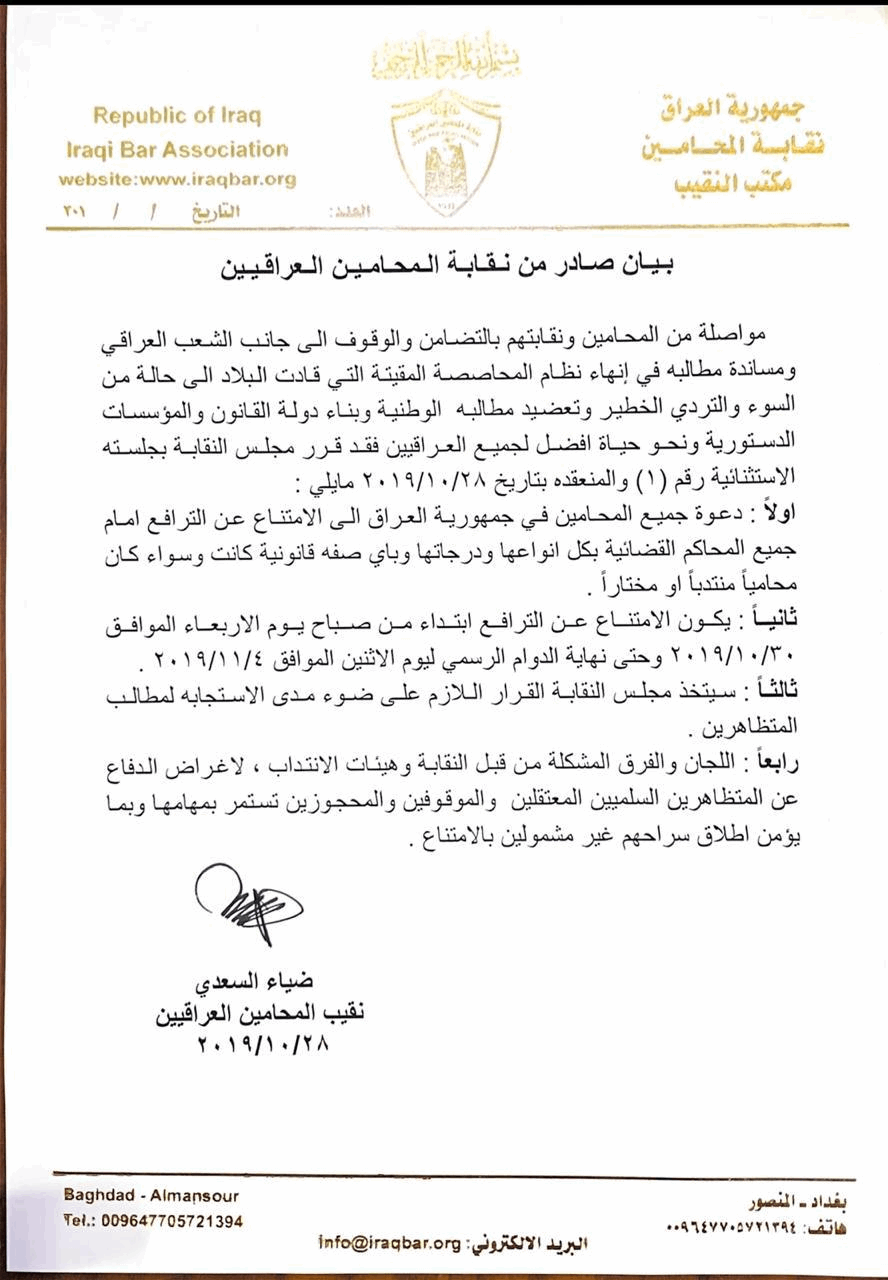 دعت نقابة الصحفيين، الاثنين، جميع الاعضاء الى الامتناع عن الترافع أمام المحاكم لأربعة أيام، فيما أكدت استمرار اللجان والفرق المشكلة من قبل النقابة للدفاع عن المتظاهرين السلميين المعتقلين للاستمرار بمهامها.