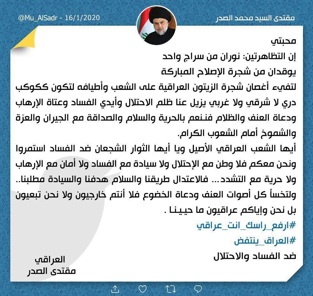 الحشد للمتظاهرين: استمروا في تظاهراتكم وحافظوا على سلميتها وعندها سنهزم دواعش الفساد