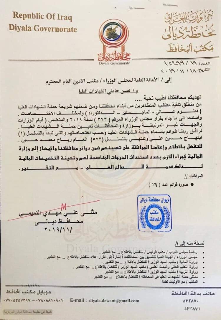 محافظ ديالى يخاطب الامانة العامة لمجلس الوزراء لغرض تعيين حاملي الشهادات العليا (وثيقة)