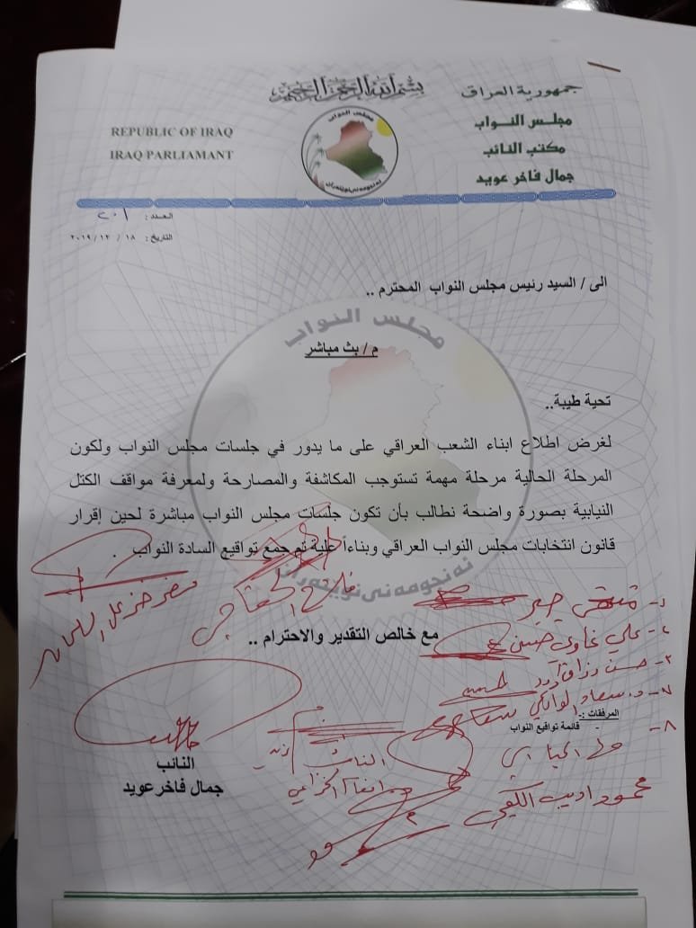 وقال فاخر في بيان تلقت وكالة من كربلاء الخبر نسخة منه، إنه "تم جمع تواقيع ٢٤ نائبا والجمع مستمر لتقديم طلب الى رئاسة البرلمان كي تكون جميع الجلسات المتعلقة بقانون انتخابات مجلس النواب علنية وامام وسائل الاعلام".