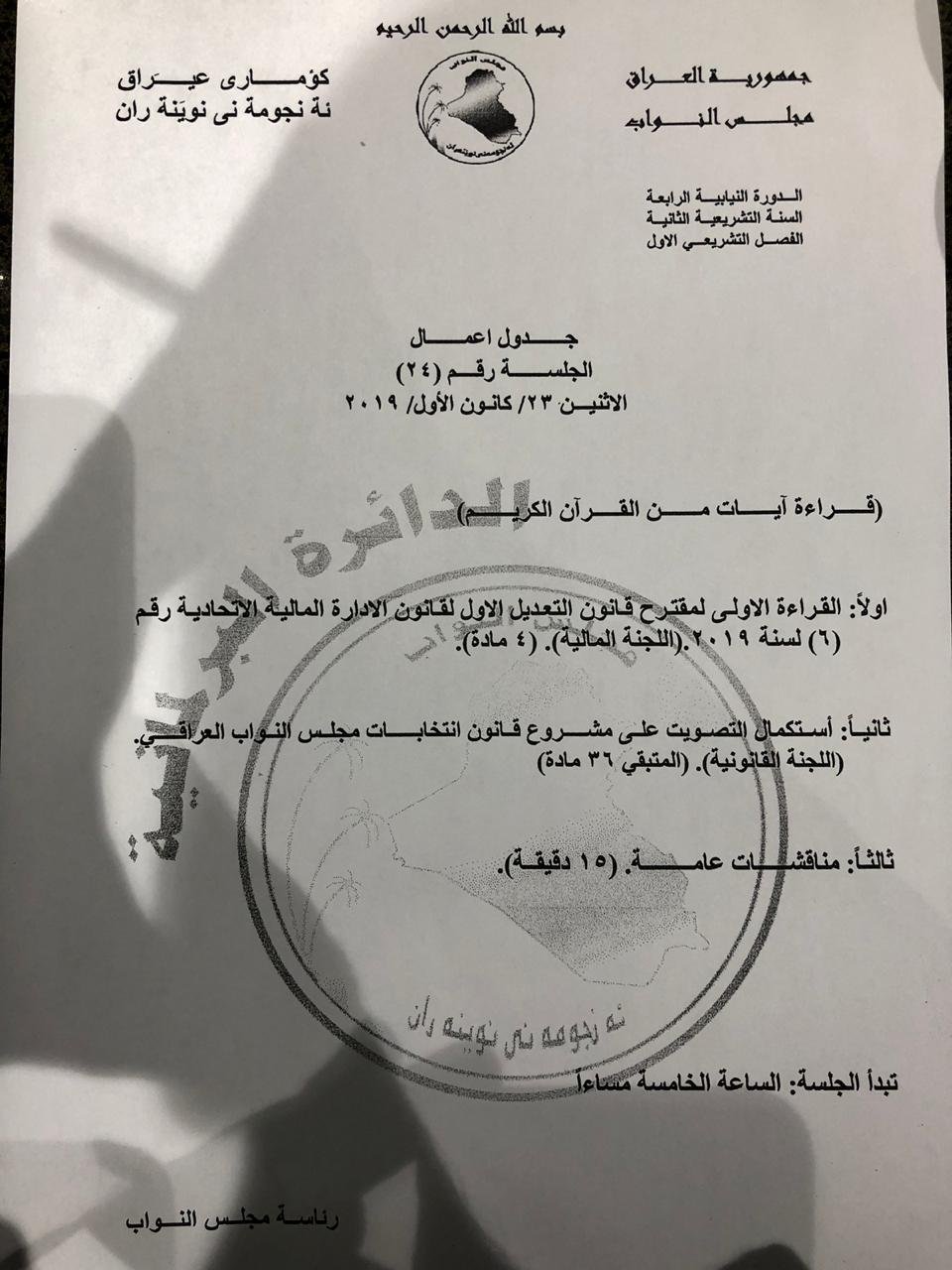 تنشر وكالة من كربلاء الخبر جدول اعمال جلسة مجلس النواب لهذا، اليوم الاثنين، والتي تتضمن التصويت على قانون انتخابات مجلس النواب.