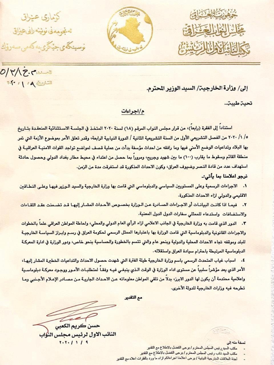 تنشر وكالة من كربلاء الخبر وثيقة موقعة باسم النائب الاول لرئيس البرلمان حسن الكعبي يخاطب فيها وزارة الخارجية.